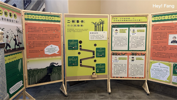 此外,樓梯下方也特別為小學生設計了二林事件的互動展區。展板文字不僅淺顯易懂、附有注音,幫助學生更好理解事件背景,還設計了反思問題與簡單有趣的挑戰遊戲,讓學習歷史不再只是被動接受,而是主動思考。